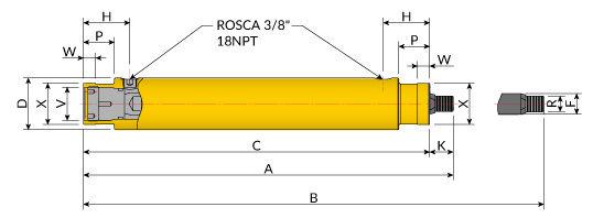 DescriçãoDesenvolvido principalmente para ser utilizado nas aplicações de produção, este cilindro hidráulico de dupla ação pode ser operado nos dois sentidos, característica que o torna versátil. Ele possui roscas localizadas no colarinho, na ponta de sua haste, e também em sua base, possui duas roscas fêmeas de 3/8” NPT.