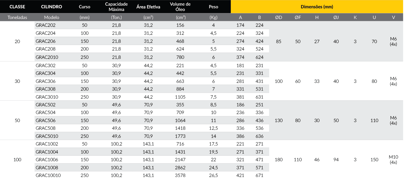 Estes cilindros não devem ser utilizados em operações de produção, pois são projetados para suportar 5.000 ciclos em sua vida útil em função do limite de fadiga de material para alumínio. Em operações de manutenção esta quantidade de ciclos é suficiente para a vida útil do equipamento.
