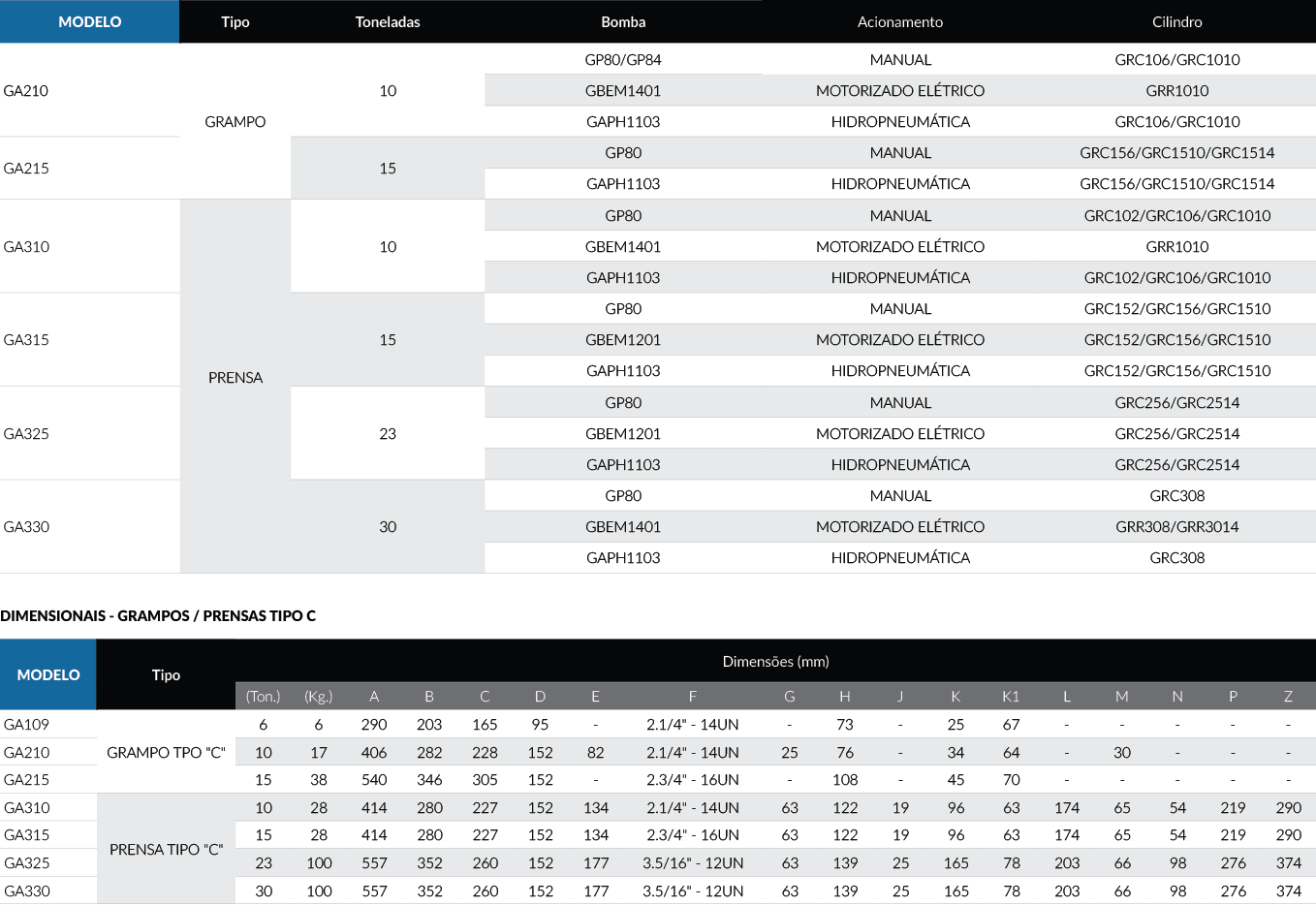 DescriçãoOs grampos e prensas tipo C foram desenvolvidas para serem empregadas em aplicações de furar, prensar e inúmeras outras existentes no mercado, mantendo-se leves e também portáteis. Podendo ser manuseados e utilizados em qualquer posição, sempre em conjunto com a bomba de acionamento, mangueira e cilindro. Suas estruturas possuem nervuras reforçadas que permitem grande abertura frontal, trabalhando assim com a máxima capacidade de aproveitamento.
