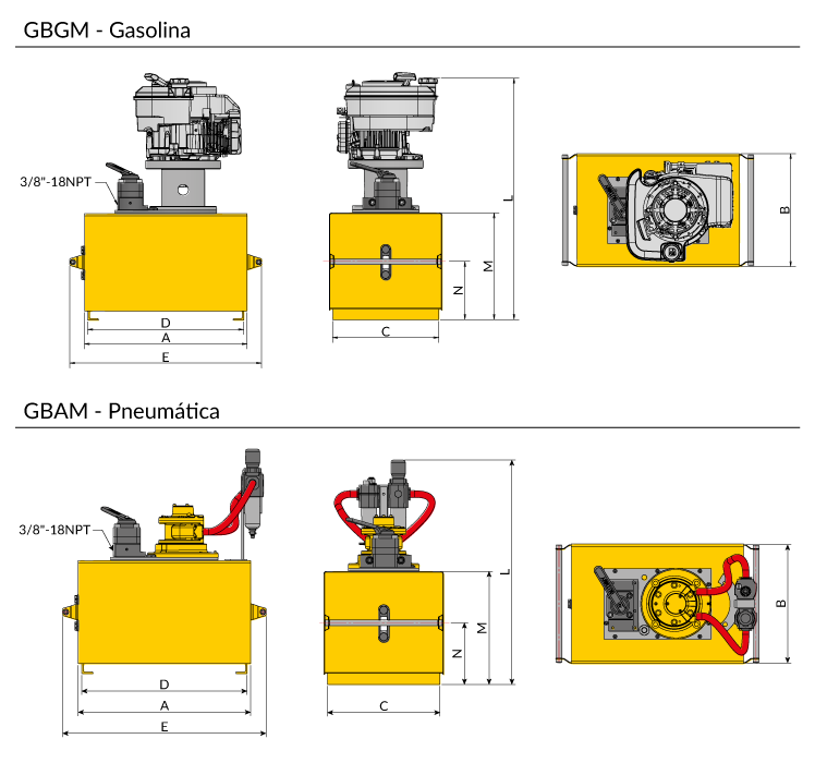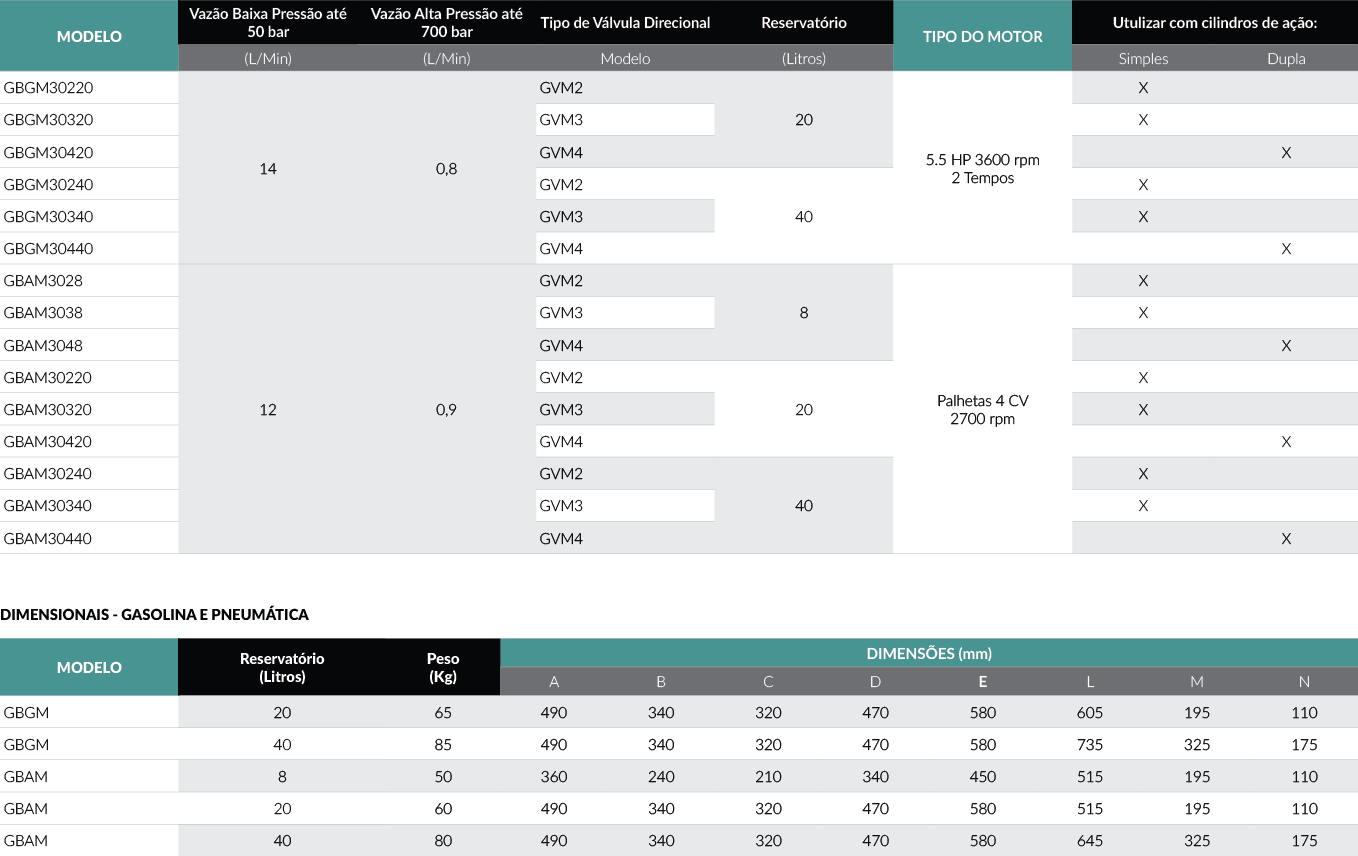 DescriçãoAs bombas GBAM com acionamento pneumático e GBGM com acionamento através de motor a gasolina, são unidades hidráulicas da série 3.000 desenvolvidas para operar em 2 estágios de pressão, sendo o primeiro até 60 bar e o segundo a partir de 60 até 700 bar. As válvulas direcionais que podem ser de 2, 3 ou 4 vias e podem ser instaladas com acionamento manual, elétrico, ou pilotado, proporcionando maior versatilidade ao produto.